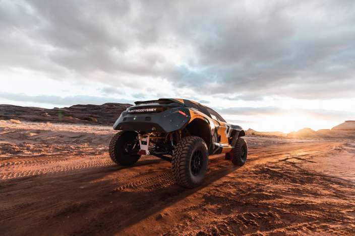 El Oddysey 21 hace trabajar la importante amortiguación, agitándose antes las leves hondonadas. Así avanza los pilotos, entre el control del auto y risas se dirigen hacia las paredes de arena y roca. Nunca llegan a ellas, ya que el camino los lleva a la izquierda y a negociar una duna. El auto utiliza toda la potencia para ascender.