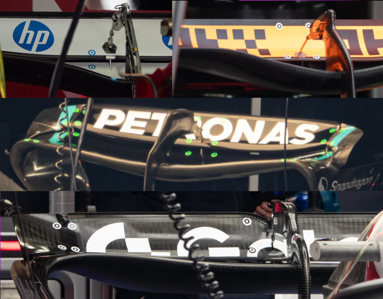 A pesar de todo, lo más relevante de los alerones delanteros son los detalles que tienen, ya que cada equipo ha encontrado una manera diferente de optimizarlos y de conseguir que cumplan el mayor número de funciones de acuerdo con el interés del diseño general del monoplaza. En el caso de Mercedes, los planos están redondeados y tienen numerosas pletinas que unen cada elemento, en Alpine o Ferrari los bordes son más finos para generar algo más de carga en la parte superior de cada plano y en McLaren han dado una forma diferente a cada elemento mostrando tener un diseño muy desarrollado.