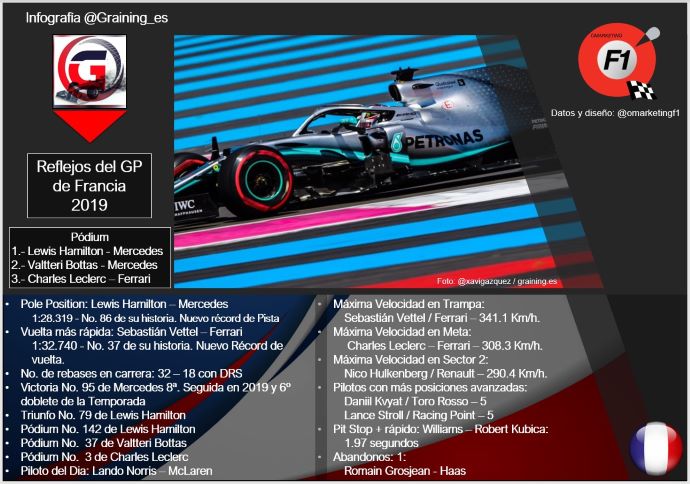 Adicionalmente el Gran Premio francés arrojo muchos datos y récords que aquí compartimos como los Reflejos del GP de Francia 2019.