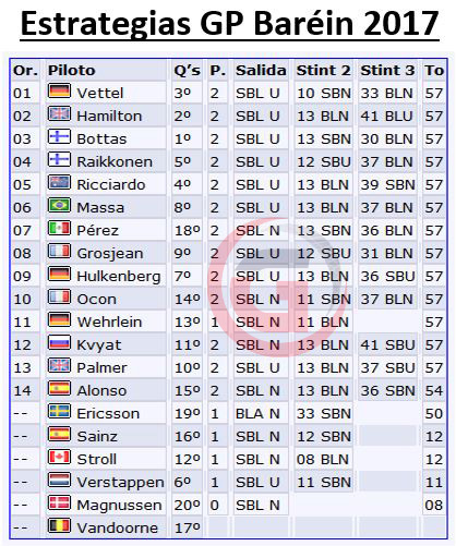 Llega la carrera con un ventoso domingo de Pascua que llena de polvo y arena la pista. Los diez que pasaron a Q3 la víspera montan los superblandos usados en Q2 y, el resto, todos superblandos nuevos excepto Ericsson que pone un juego de blandos nuevos en su Sauber para comenzar la carrera siendo el único que empezó con “amarillos”