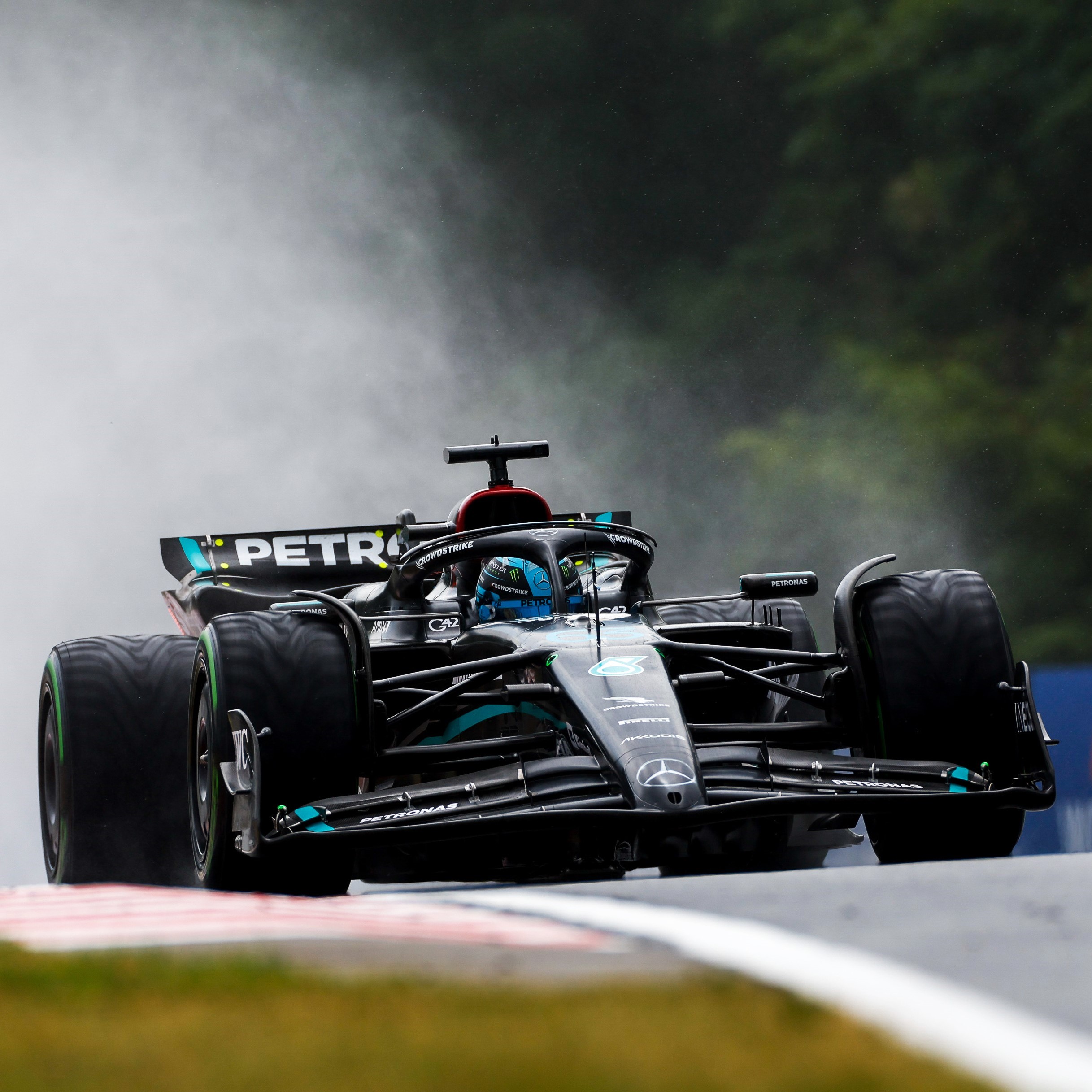El equipo Mercedes probó un programa diferente, y sus pilotos quedaron por detrás en la sesión en seco. La lluvia, sin embargo, dejó a Russell delante y Hamilton detrás.